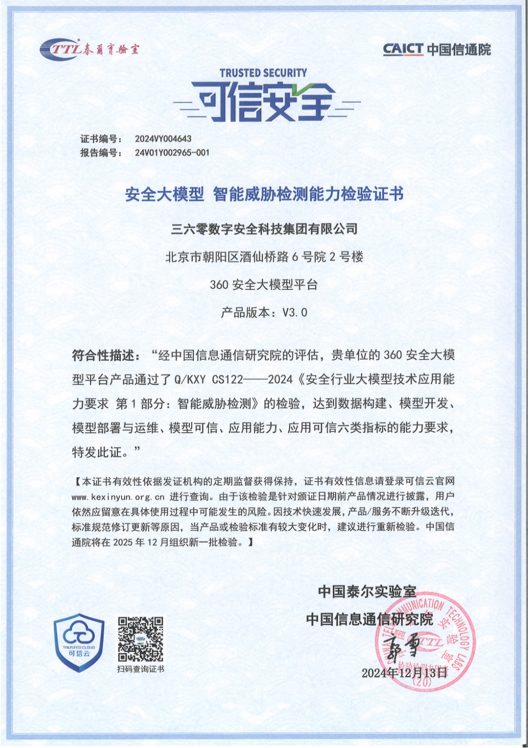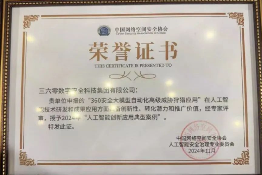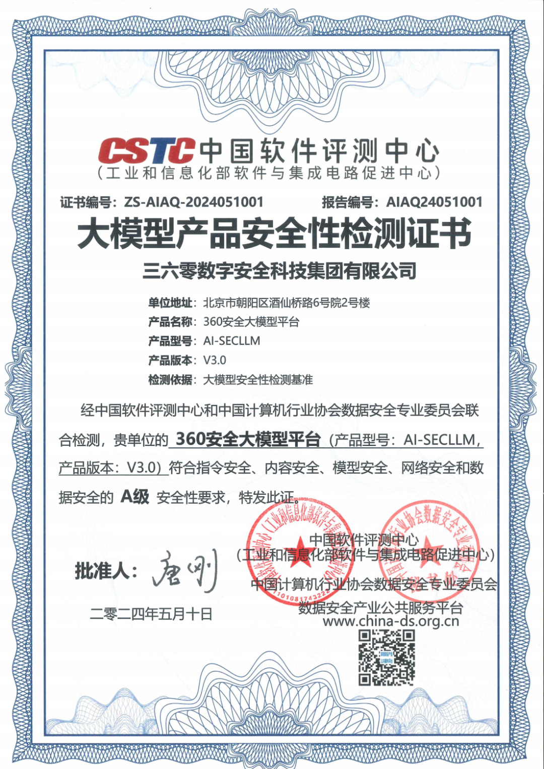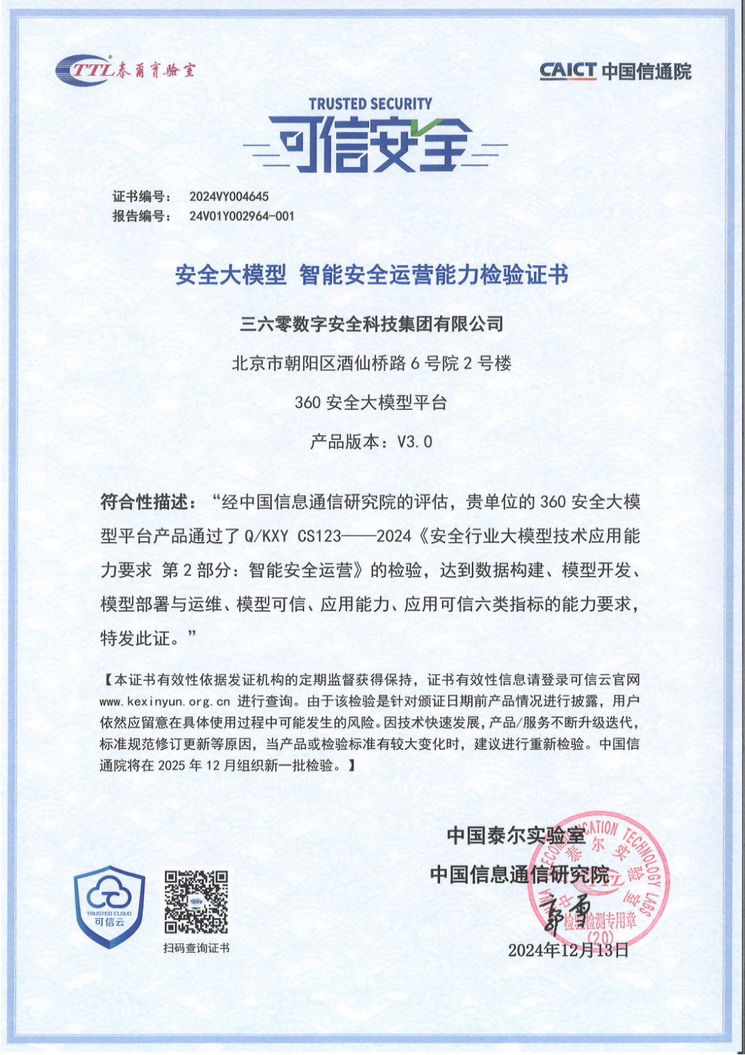 2024年,360安全大模型凭借领先的技术优势和创新能力,在行业内引发广泛关注,斩获国内多项权威认证及奖项。
