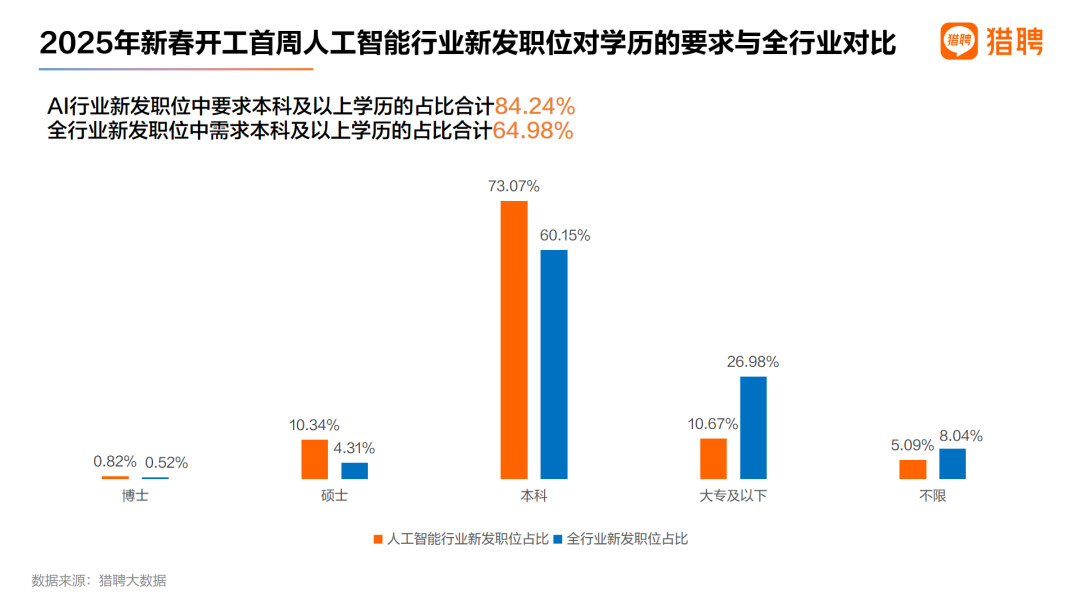 2)人工智能行业热招职能中算法工程师居首,该行业要求本科及以上的学历占比超80%从人工智能行业今年开工首周的新发职位位居前五的是算法工程师、销售经理/主管、解决方案、测试开发、产品经理,其中算法工程师的占比明显超出其他职能。人工智能行业作为高科技属性极强的领域,进入门槛较高,今年新春开工招聘职位对学历的要求较高,其中对本科及以上的学历要求占比84.24%,而全行业对本科及以上的学历要求占比64.98%,前者远远高出后者。随着人工智能技术的广泛应用,对人才的需求急剧增加,但市场上符合要求的高学历人才却相对短缺。为了吸引和留住高学历人才,企业纷纷提高薪资待遇,并提供良好的工作环境和发展机会。