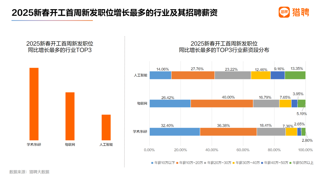 从新发职位行业增长来看,学术/科研、物联网、人工智能位居前三,较上年开工首周同比增长51.48%、34.10%和18.25%。其中人工智能行业的高薪区间职位比重较高,20万以上年薪占比为58.19%,远远超出其他两个行业。人工智能行业不仅增长迅速,而且高薪职位众多,成为职场中的热门选择。2025年新春之际,DeepSeek凭借其卓越的技术创新能力、极致的用户体验、广泛的应用场景覆盖以及不断攀升的国际影响力,在全网范围内掀起了一股热潮,为持续升温的AI技术浪潮再添强劲动力,进一步推动了相关人才需求的增长。