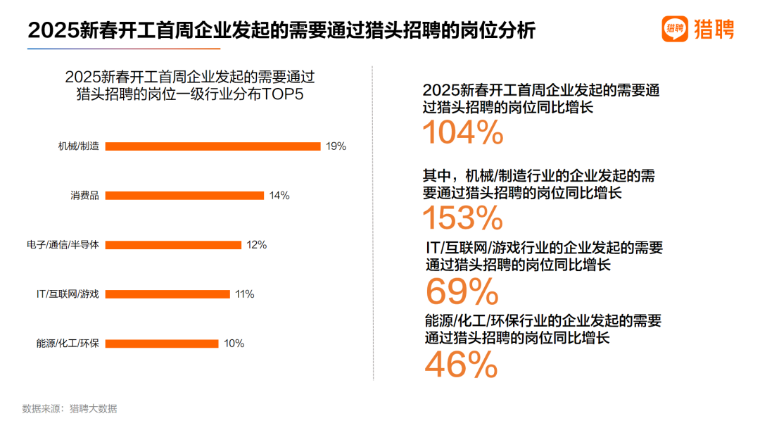 值得注意的是,算法工程师类职位不仅增长较快,而且有显著的高薪优势:年薪超20万的算法工程师职位占比高达88.53%,彰显了其薪酬水平的竞争力。进一步细分,年薪30万以上、40万以上、甚至50万以上的职位占比分别达到了67.40%、47.32%、30.11%,这无疑印证了招聘市场对算法工程师这一职位的极度渴求与高度重视。在新春开工首周猎聘平台全行业三级职能分布TOP10中,普工/操作工位居第九,而投递这一职类的人数同比增长超过了100%。普工/操作工作为制造业和服务业的基础岗位,其需求量的稳定增长反映了实体经济持续发展的活力与韧性。即便在数字化、智能化转型的大潮下,这些传统岗位依然扮演着不可或缺的角色。在当前就业形势下,求职者对于这类岗位的兴趣和认可度在提升。这与就业观念的转变有关,即越来越多的人开始重视实操技能和稳定就业的机会,更加倾向于选择风险较低、就业门槛相对不高的岗位有关。2、企业发起的需要通过猎头招聘的职位量激增,同比增长超100%根据猎聘的猎头职位招聘工具“入职快”使用数据追踪,2025新春开工首周,猎聘平台企业通过“入职快”发起的需要通过猎头招聘的职位量出现爆发式增长,较去年同期增长了104%,实现翻倍式增长。这一显著变化直观反映出,在当下的市场环境中,企业对高端人才的需求愈发强烈。