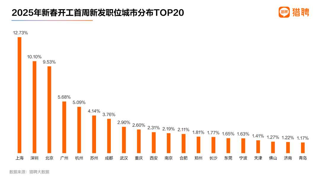 在开工首周新发职位的城市分布TOP20中以一线城市和重点新一线城市为主,上海、深圳、北京位居前三,占比为12.73%、10.10%、9.53%;广州位居第四,杭州以与广州的微小差距排名第五,苏州紧随其后,两者领先其他新一线城市。一线城市和重点新一线城市在就业市场上的主导地位依然稳固,它们凭借着强大的经济实力、丰富的产业资源、优越的营商环境以及较高的人才吸引力,成为了企业招聘和人才求职的首选之地。杭州、苏州以其新兴产业、政策以及历史文化、区域优势,吸引了大量企业聚集,带动了当地人才需求。