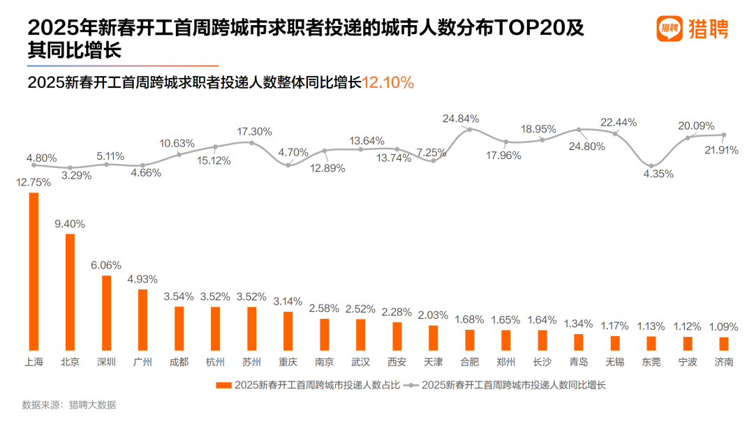 2、跨城求职意愿增强:投递上海的外埠求职者最多,投递合肥与青岛的人数增长最强劲开工首周,众多求职者踏上了跨城求职的新征程,猎聘平台上跨城市投递简历的求职者数量较去年同期增长了12.10%,彰显出职场人的活跃与流动性。从各大城市接收的外埠求职人数分布TOP20来看,上海、北京、深圳、广州稳居前四,以其独特的魅力展现出强大的磁吸效应。而成都、杭州、苏州、重庆、南京、武汉则紧随其后,位列第五至第十,各自散发着独特的城市魅力。