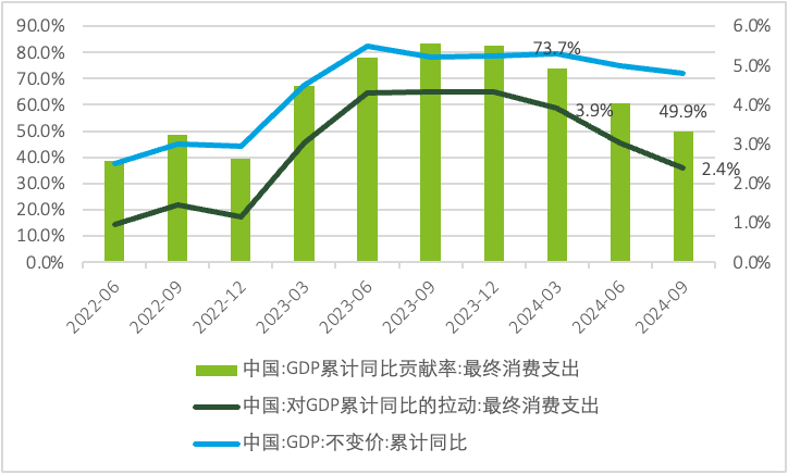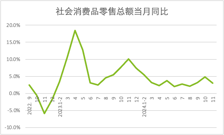 回看2024年前11个月的消费数据,前三季度消费对经济的拉动作用逐季下降。社会消费品零售总额增速自3月以来也在低个位数徘徊。9月末增量政策推出后,市场在以旧换新政策带动下有所回暖。据国家统计局公布的数据估算,限额以上汽车、家电、家具、建材类商品销售分别拉动10月、11月社零同比增长1.48和1.76个百分点。消费者信心指数也在连续6个月下滑后在10月出现首次回升,但仍然低于基准线。
