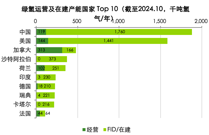 图: 绿氢运营及在建产能排名前十国家 (截至2024年10月)