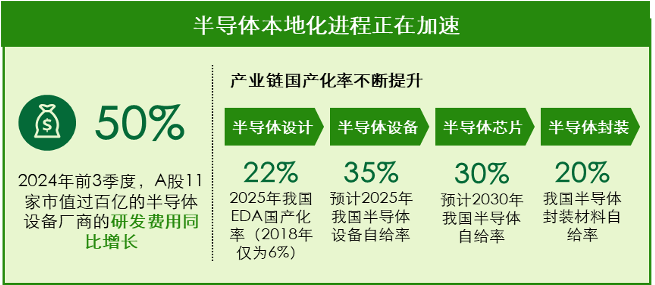 半导体供应链本地化正加速进行:在多轮出口管制落地后,中国半导体设备公司的研发支出快速抬升,以2024年前3季度为例,A股11家市值过百亿的半导体设备厂商的研发费用同比增长50%,研发费用占营业收入达14%1,预计2025年我国半导体设备自给率将提升到35%2。而在芯片设计方面,国内EDA(Electronic Design Automation)产业国产化进程明显提速,预计EDA国产化率从2018年的6.2%3将提升至2025年的22%4。