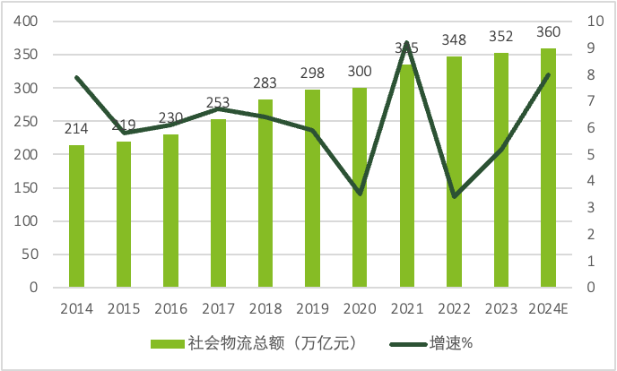 根据中国物流与采购联合会发布的数据,2024年前三季度,全国社会物流总额为258.2万亿元,同比增长5.6%,预计全年将达到360万亿元;社会物流总费用13.4万亿元,同比增长2.3%,社会物流总费用与GDP的比率为14.1%。其中受益于消费电商平稳增长,快递业务月均业务量达到140亿件,截至2024年11月17日,中国快递业务量超1500亿件。中国已进入年快递业务量超千亿件、业务收入超万亿元的新阶段。结合12月12日召开的中央经济工作会议精神,2025年将继续大力提振消费、全方位扩大国内需求,物流供应链作为支撑消费新场景的核心元素,仍将持续发展,为提振消费提供质量与效率保障。