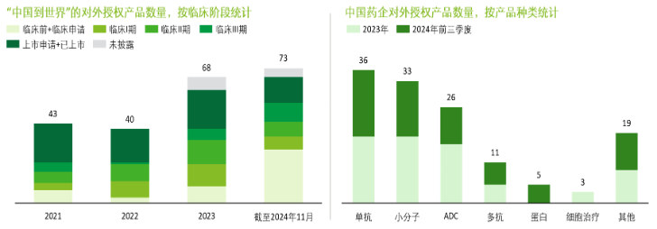 出海变得更为重要,模式变得更加多元。2024年中国创新药械企业积极走出中国,出现更多的“出海”行动,例如自主出海、战略合作的联手出海、以及许可交易和收并购为主的借船出海。多家跨国药企与中国生物科技企业达成战略合作,共同开发创新资产;超60个本土研发创新资产在2024年成功授权出海;4家中国本土创新药企业被跨国大药企收购。海外市场对于中国创新资产的认可度持续提高并加速获得中国原创性优质资产,未来预期更多企业积极出海,以寻求更广阔的市场空间。