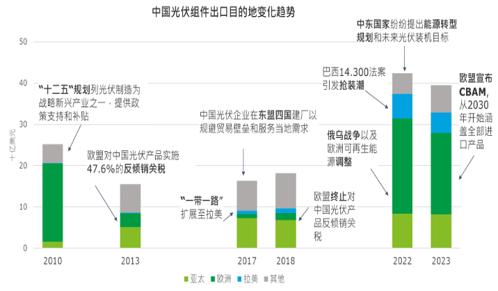 图:中国光伏组件出口主要目的地变化趋势及主要驱动事件