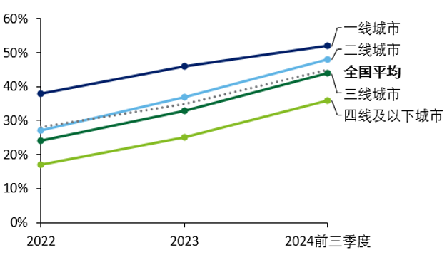 下沉市场消费潜力挖掘:下沉市场体量巨大。从体量来看,三线及以下城市占据了全国一半左右的消费占比。根据各地统计局数据估算, 2023年社会消费品零售总额超过千亿元人民币的地级市达到了82个,占到全国社零的33%。新消费品牌可以加快通过电商和轻量化店型试水潜力市场。与此同时,下沉市场的消费增速和服务消费的增加,体现了其较强的消费升级意愿。根据同程数据显示,24年国庆出境长线游的客源地开始由一线城市向非一线城市转移,在出境长线游消费者中,三线及以下城市居民占比超过40%。
