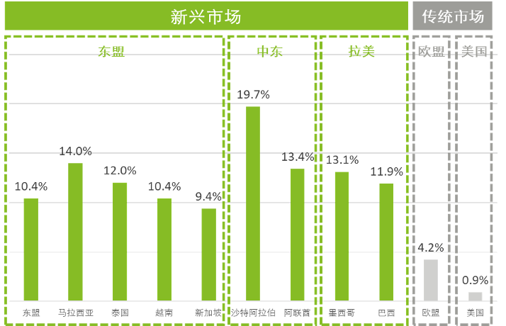 图:2018-2023年中国对主要市场出口总额复合增长率