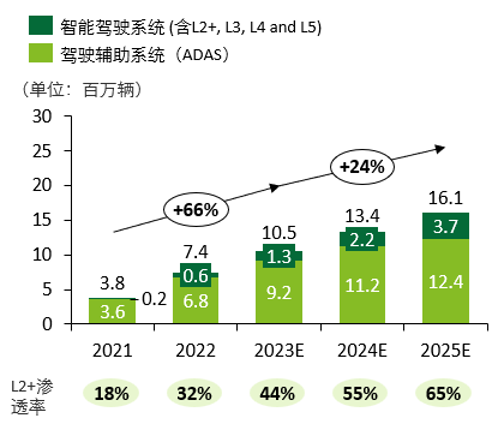 图:智能驾驶(L2及以上)在新车销售中的占比预测(2021-2025)