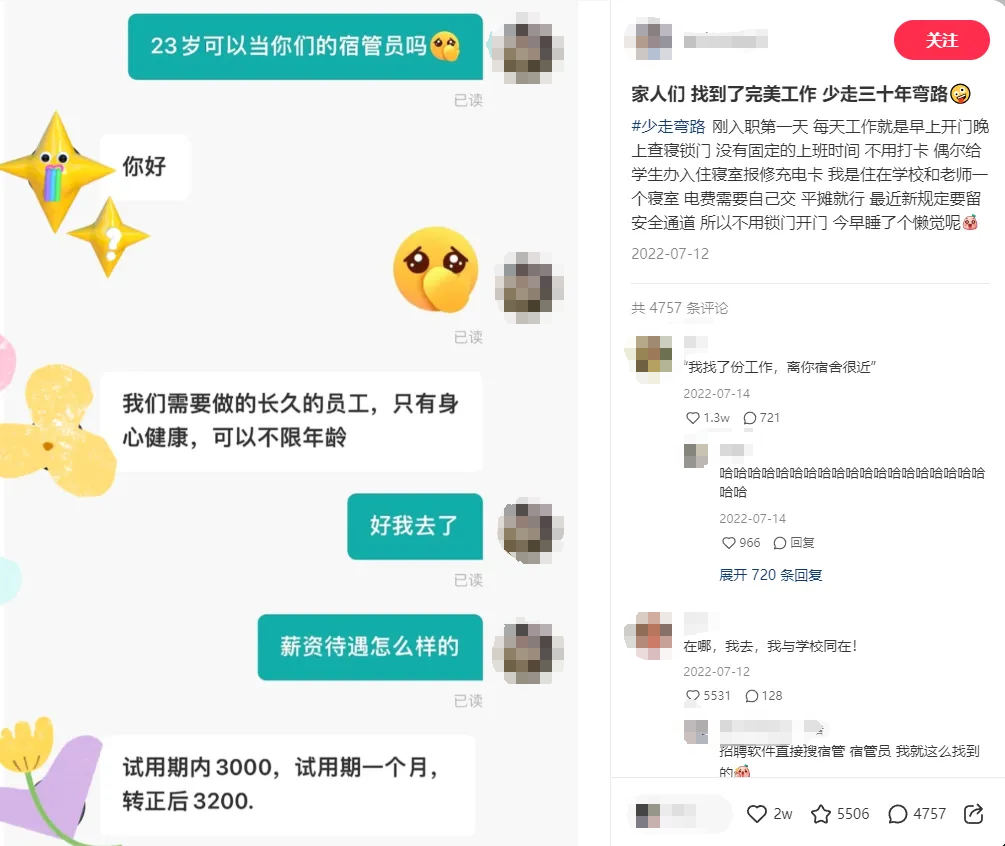 至于吃住,则可以都在学校食堂和员工宿舍解决,堪称是工作界的性价比之王了。