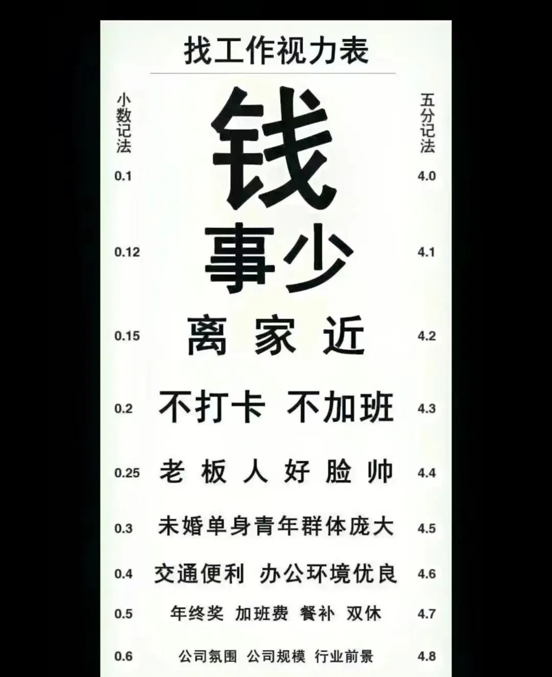看到了一张很有趣的图,叫做——年轻人找工作视力表。