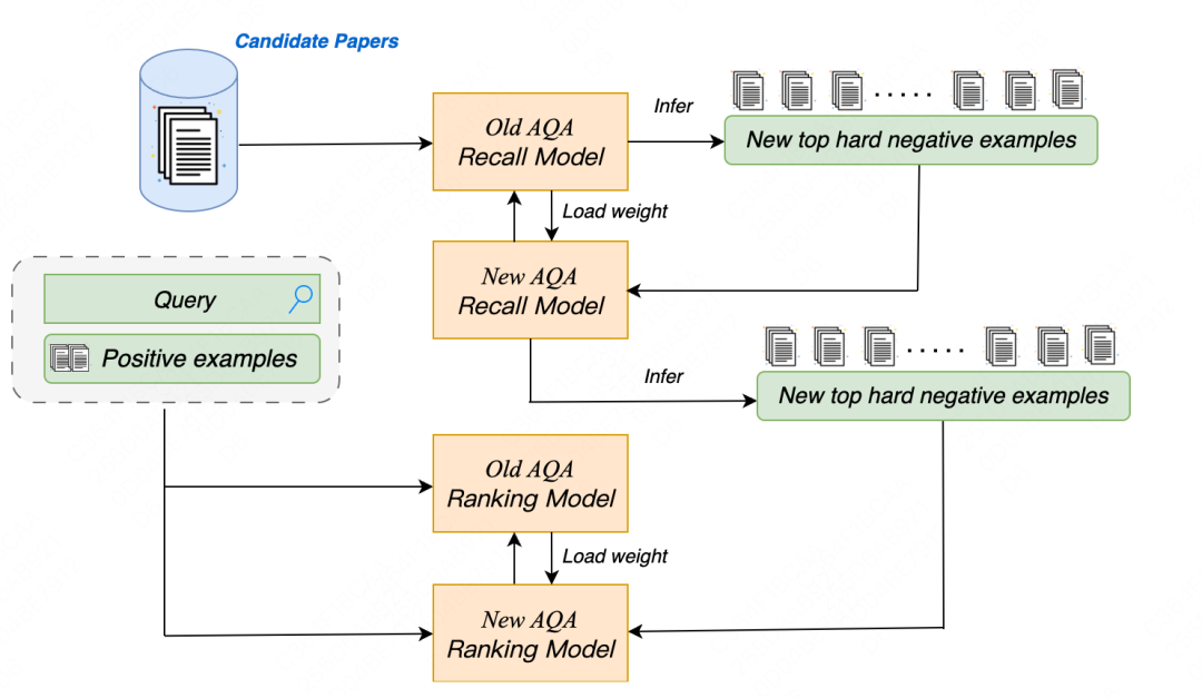 召回(Recall):在此次竞赛中,用户查询的候选论文集包含成千上万的论文。为了确保效率和实用性,将任务分成召回和排序两个过程是一个切实有效的策略,我们基于SFR-Embedding-Mistral 进行指令微调,微调采用对比学习损失函数,每一个batch迭代过程中,对每一个正样本,我们随机从100个难负样本中抽取3个负样本,并联合batch内其他负样本计算一个样本的损失。每次迭代我们固定轮次10轮,学习率1e-4,若采用QLORA进行微调可进行单卡微调。 排序(Ranking):在排序优化中,我们同样采取指令微调的方式,基于SOLAR-10.7B-Instruct-v1.0模型,微调采用交叉熵损失函数,每一个batch迭代过程中,对每一个正样本,我们随机从100个难负样本中抽取3个负样本计算一个样本的损失函数,每次迭代我们固定轮次10轮,学习率1e-4,若采用QLORA进行微调可进行单卡微调。 Boosting迭代:在召回模型和排序模型的训练中,负样本是至关重要的。我们制定了一种困难负样本挖掘方法来进一步提高模型的性能即采用迭代的方法进行困难负样本挖掘,如图3所示。在召回模型的训练中,在初始迭代时,我们使用开源的SFR-Embedding-Mistral模型来检索前100个困难负样本。这些样本然后用于微调以获得增强的模型。在随后的迭代中,利用上一轮改进的模型来检索前100个困难负样本,并进一步进行微调。对于排序模型,我们继续使用由召回模型检索到的困难负样本进行训练。这个迭代过程确保每一轮训练都能提升模型在上一轮中的性能。