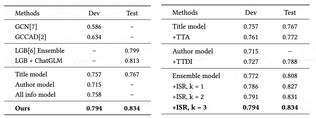 Grafting-Learning For DataSet:多个不同数据集之间的标注规则存在差异,由于本次存在规则标注的数据集,其标注质量较低但数据集规模极大,巧妙利用该数据集能够带来较大的指标提升。我们提出了Grafting-Learning For DataSet技术,在规则数据集上对BERT进行微调,并将其最后一层隐状态作为人工标注数据集的额外特征,用于训练第二个BERT模型。这种方法巧妙地嫁接了规则数据集的有效正标签信息。同时,我们在消融实验下发现嫁接学习的方式比普通迁移学习(即在规则标注数据集微调后的BERT模型再用人工标注数据集微调)更具鲁棒性。由于两类数据集的标签分布差异较大,普通迁移学习甚至会带来负收益,而嫁接学习能够有效保留有益信息、摒除无益信息。 Grafting-Learning For LongText:长文本训练和推理会显著增加时间和显存消耗。为缓解该现象,团队提出了Grafting-Learning For LongText技术,将多来源的文本分别经过不同的BERT进行有监督微调,最终每条数据都将得到多个不同来源的模型预测概率,此时噪声文本中的有效信息增益都被BERT模型提取完成,再将预测概率输入到ChatGLM中,即可用较短的文本和BERT预测概率进行最终的模型判断。此方法能够有效避免在Attention计算时由于文本过长导致时间开销平方级爆炸增长,将其切割后利用小模型BERT提纯噪声,只保留过滤后的BERT预测概率用以做最终判断。同时,由于采用了多个BERT模型提纯去噪,高噪声对最终结果的影响进一步降低,模型输出结果更加置信。 Automatic RAG & Feature Engineering:在超大规模无标注数据集(DBLP数据集)中,存在着每篇论文对应的少量辅助信息,同时也存在大量相似论文的噪声信息。团队提出的Automatic RAG & Feature Engineering技术能够自动分析每篇论文的重点,于DBLP数据集中找到其对应的辅助信息,同时在RAG链路过程中就完成了一系列特征工程的构建。在辅助信息和特征工程的帮助下,模型能够以更短的输入产出更可信的结果。