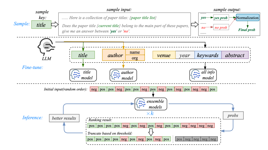 为了尽可能利用更多信息以及尽量减少训练所用资源,我们使用了一种拆分策略、在微调阶段我们使用多源数据对多个模型独立微调,以确保每个模型能够专注于特定的信息源,我们使用deepspeed[2]的zero1来在训练时长和显存占用方面取得平衡,微调方法用LoRA[3]和QLoRA[4]。通过实验,我们确定了标题和作者是最关键的两个信息,其他信息则不在单独训练模型以避免资源浪费。为了利用到其他信息,我们对所有可用信息源进行微调得到一个综合模型,用于模型结果集成,进行信息互补。