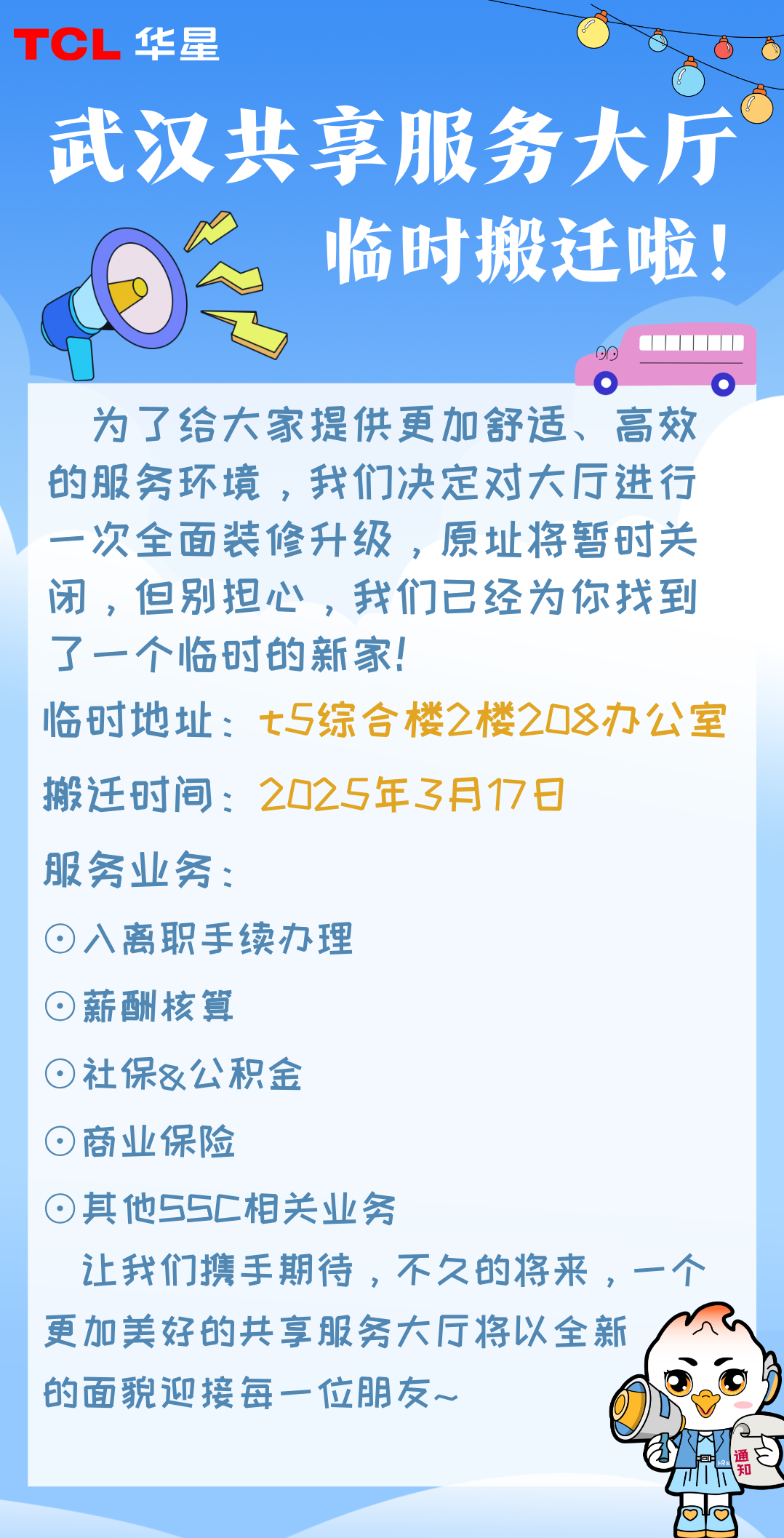 武汉华星丨SSC大厅临时搬迁啦!