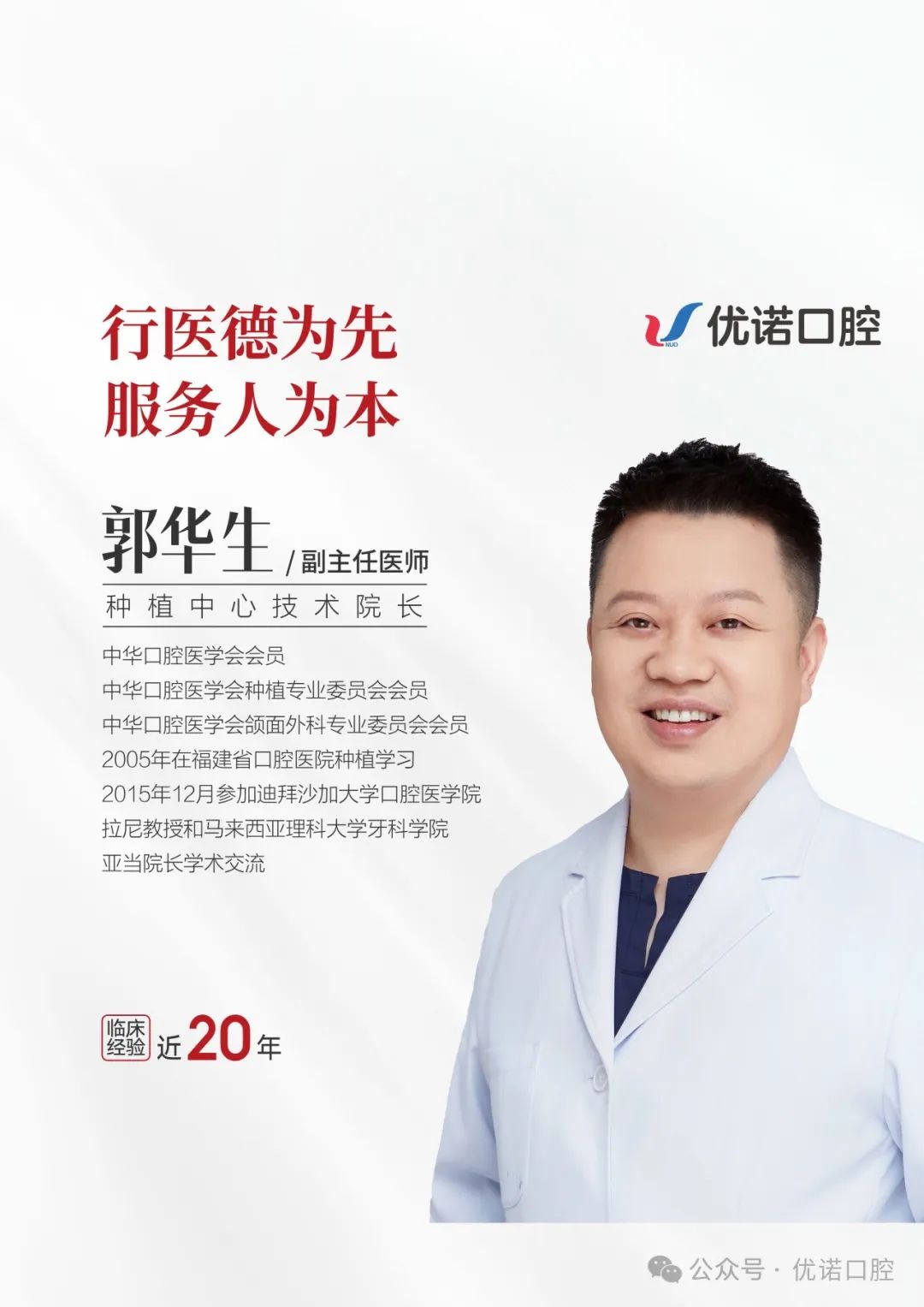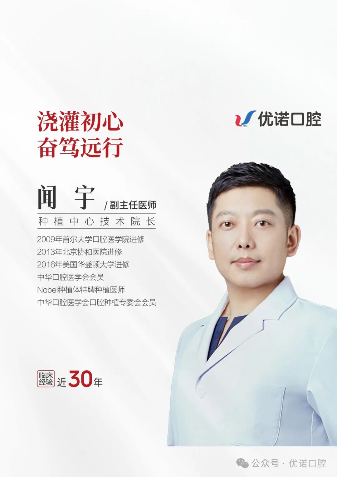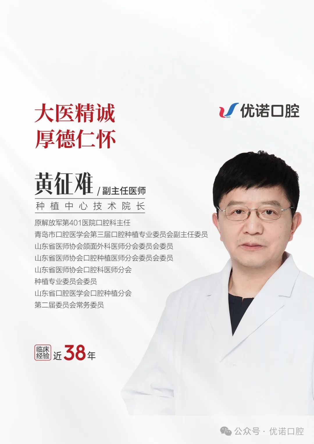 在口腔健康愈发受重视的当下,优诺口腔第九届种牙节盛大开启,以医生、技术、服务、材料(产品)、价格 5五个维度的全方位保障,为缺牙患者带来恢复口腔健康、重拾咀嚼自由的希望。其中,种植医师团队作为核心力量,是此次种牙节的关键亮点。优诺口腔的种植医师团队堪称豪华,汇聚了多位经验丰富、技术精湛的院长级专家,他们各自有着独特的技术专长。黄征难:疑难 / 高龄种植尖端技术的引领者, “全口重建” 诊疗体系带头人黄征难院长在公立医院口腔临床领域深耕近 40 载,治愈数百位疑难、高龄复杂疑难患者,治愈常规缺牙患者更是数不胜数。他身兼多个专业委员会的重要职务,擅长全口无牙颌即刻负重修复技术、All-on-4/6 技术、疑难高龄种植修复技术等,能够应对各种复杂的口腔种植情况。他所主导的全口重建诊疗体系,通过多学科联合诊疗、先进的诊断技术和个性化的种植方案,为患者提供一站式综合服务。他丰富的临床经验与熟练的种植技术,让许多患者慕名而来,患者们更给予黄院长高度的信任、依赖与美誉。闻宇:深耕无感化种植领域领军专家,践行种植7S金标准,让种植更规范闻宇院长毕业于哈尔滨医科大学,是中华口腔医学会会员及口腔种植专委会会员,还是诺贝尔种植体特聘种植医师。出身医学世家的他,在学术和临床方面都不断进取,参加了众多高难度种植技术的进修课程。闻宇院长擅长各类牙齿缺失的种植修复及颌面部治疗,在复杂牙列缺损的修复重建、全口无牙颌的种植等方面技术娴熟。他提出的种植金标准 “一对一”,从临床检查、安全、种植体选择等多个标准出发,为患者制定个性化的种植方案,为患者带来了创伤小、康复快的种植体验。郭华生:优诺智能动态无感种植大师,5G数字化精微种植技术领航者