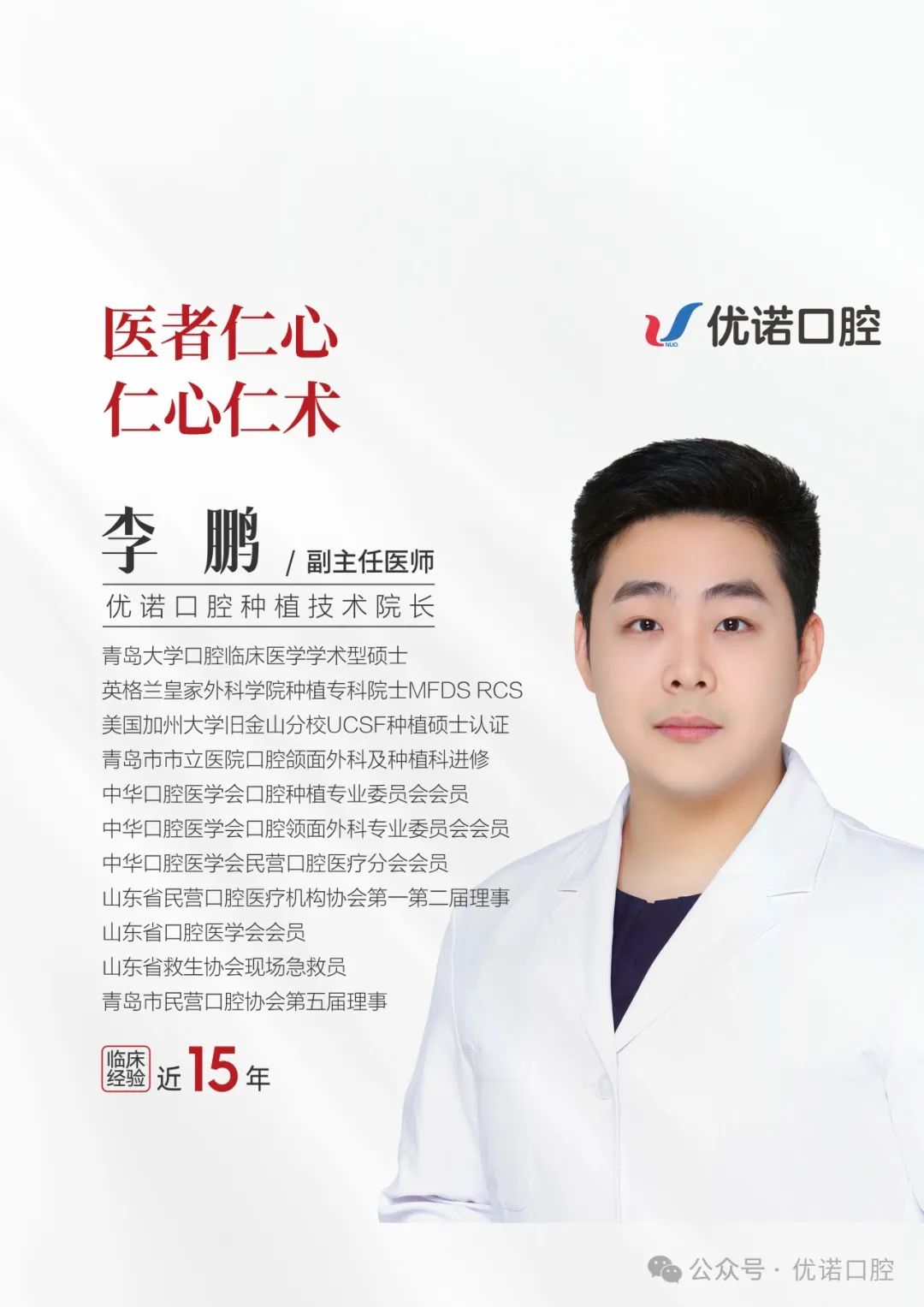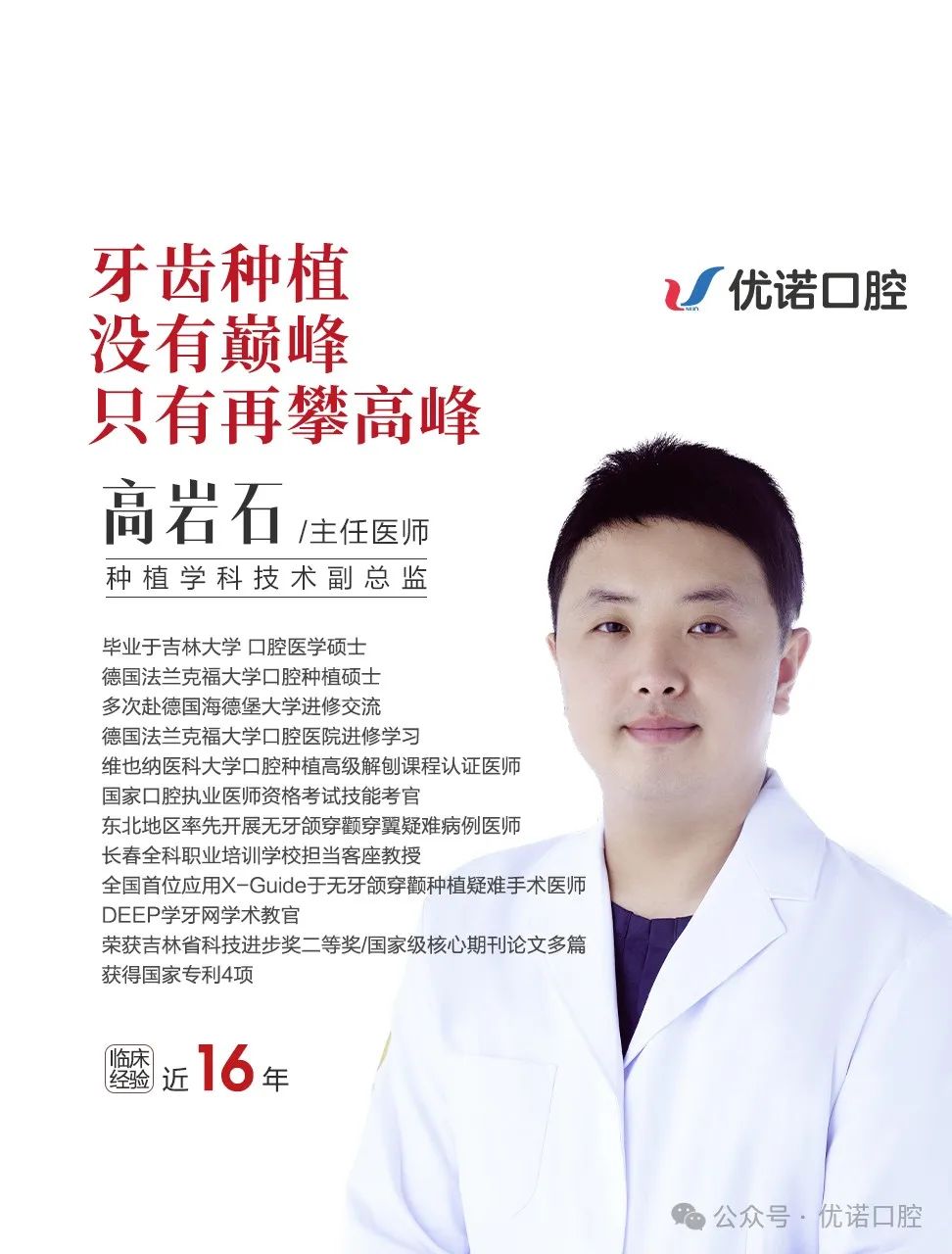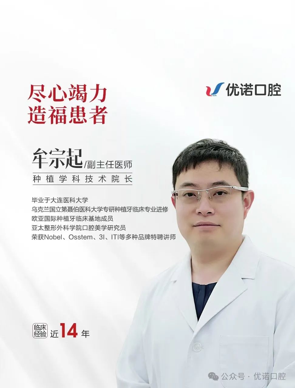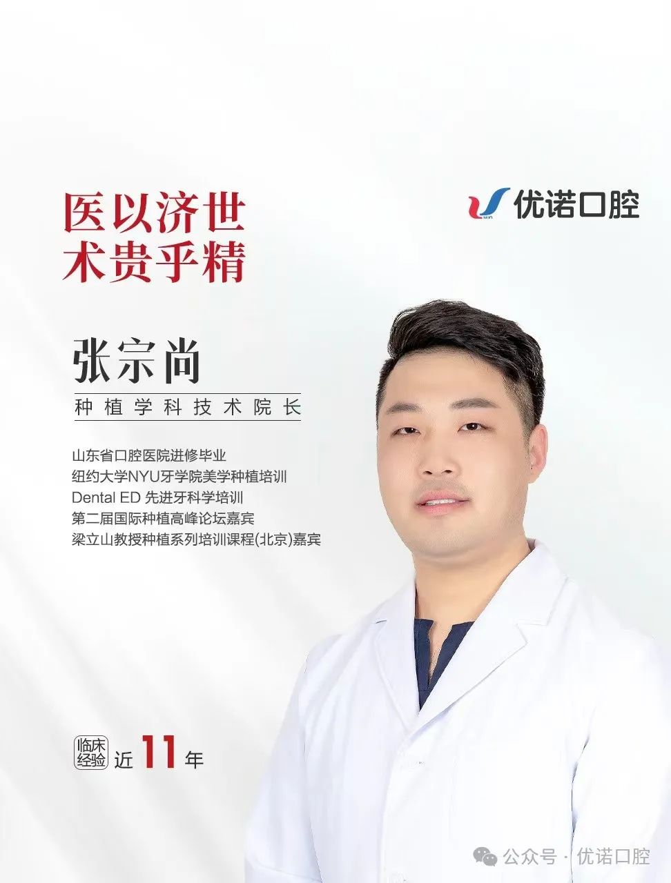 牟宗起院长是哈尔滨优诺口腔一位经验丰富的种植牙专家。他投身口腔颌面外科手术及种植牙临床工作超 10 年,积累了深厚的实践经验。牟院长擅长普通种植、微创种植牙、即刻种植以及微创即刻种植技术,能够精准把控各类种植手术的操作要点,为患者减轻术中痛苦并缩短恢复时间。他多次受邀参加国外种植学术交流活动、论坛及大会,始终紧跟国际前沿口腔种植理念与技术,并将所学融入日常诊疗。在学术成果方面,牟院长在口腔医学核心期刊发表过多篇学术论文,凭借专业能力在口腔医学业内广受赞誉。经他治疗的众多患者,都对其精湛医术与耐心态度给予高度评价,是患者在种植牙选择上值得信赖的专业医生 。张宗尚:口腔种植方案精研者,微创数字化种植技术践行者张宗尚院长在口腔种植领域有着丰富的经验与卓越的建树,他身为中华口腔医学会会员以及青岛口腔协会会员,始终秉持着医者仁心的理念,致力于为患者提供优质且全面的口腔医疗服务。他擅长制定兼顾功能性、美观度与舒适度的种植方案。在临床实践中,能熟练运用微创数字化口腔种植技术,能够精准定位,减少手术创伤,缩短患者恢复周期;对于即刻种植技术,他也掌握得炉火纯青,能让患者在拔除患牙后迅速植入种植体,极大地提升了诊疗效率。面对复杂的口腔种植病例,例如上颌窦内外提升、全口缺失牙种植等技术,张院长凭借扎实的专业功底与丰富的实操经验,也能从容应对,为众多患者成功解决牙齿缺失难题。 这些院长们不仅个人技术精湛,还带领团队形成了强大的合力。在种牙节期间,他们将亲自为患者进行诊疗,把丰富的经验和先进的技术运用到实际治疗中。除了强大的医师团队,优诺口腔在技术、服务、材料(产品)、价格方面也提供了 5A 级保障。技术上,不断引进和创新,如数字化种植技术让种植过程更加精准;服务上,提供从术前咨询到术后护理的全程跟踪服务;材料(产品)上,选用优质可靠的种植体和相关材料,确保治疗效果的长期稳定;价格上,在保证品质的前提下,提供合理透明的收费标准,让更多患者能够负担得起高质量的种植治疗。值得一提的是,种牙节期间,优诺口腔还提供免费口腔检查、建立患者口腔档案的服务。这不仅能让患者及时了解自己的口腔状况,还能为后续的治疗提供详细的参考依据。口腔健康与身心健康息息相关,缺牙不仅会影响咀嚼功能,导致营养吸收不良,还可能影响面部美观和发音,甚至对心理健康产生负面影响。因此,种牙要趁早。优诺口腔第九届种牙节,就是一个绝佳的时机。患者可以在专业院长的亲诊下,享受 5A 级保障的优质种植服务,早日恢复口腔健康,提升生活质量。不要让缺牙问题继续困扰自己,把握种牙节的机会,早治疗,早健康。