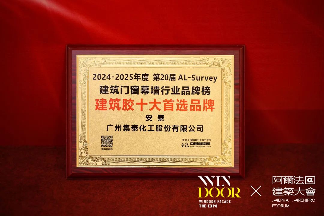3月10日,展会开幕前夕,第31届全国铝门窗幕墙行业年会举行。在会上颁发的“2024-2025年度第20届AL-Survey门窗幕墙行业大型读者调查活动”评选奖项中,集泰股份第20次获得“建筑胶十大首选品牌”肯定,并入库首选创新材料(建筑胶类)“TOP10”。