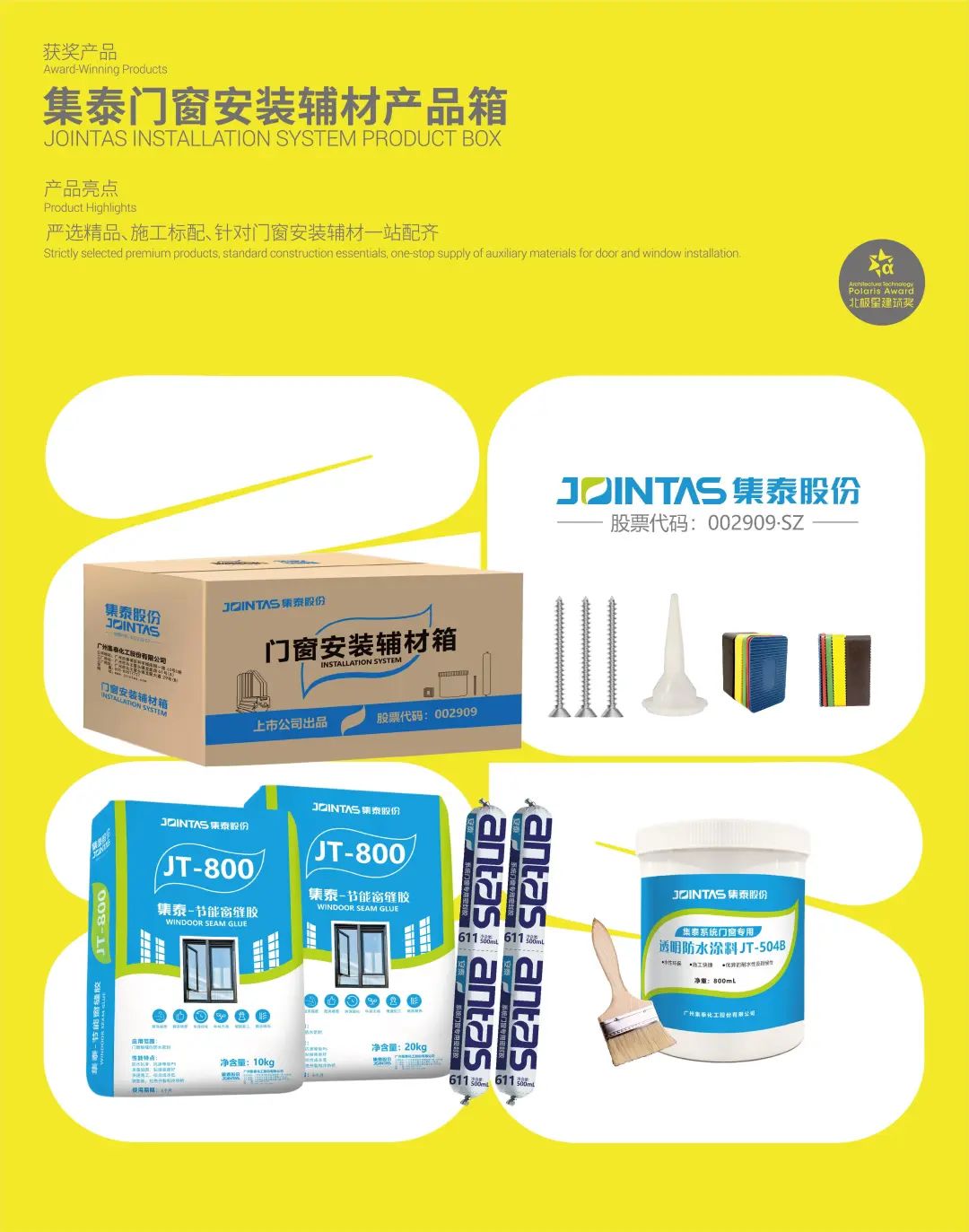 此外,集泰门窗安装辅材箱凭借其创新性与实用性,荣膺“第11届北极星建筑奖”。严选精品、一站配齐,极大地节省了采购时间和成本,真正做到一箱在手,装窗不愁!