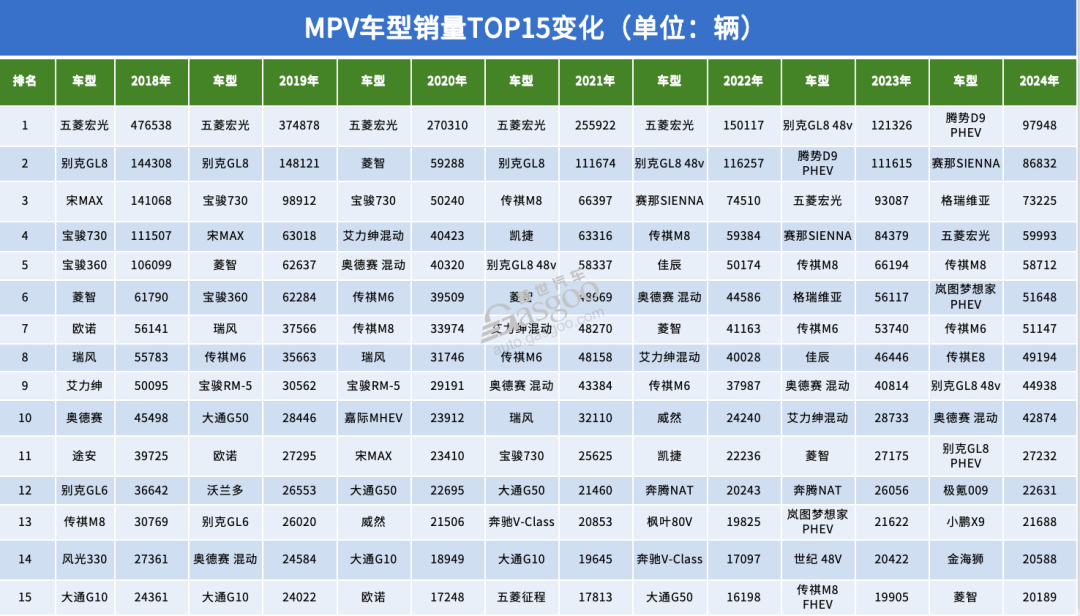 具体到三大类型2018年销量前15排名。先看MPV市场,五菱宏光一骑绝尘。随后是在高端MPV市场“称霸”的别克GL8,销量也达到了14.4万辆。在该市场,宝骏系的表现颇为亮眼,宝骏730、宝骏360两款MPV车型的销量均在前10中。