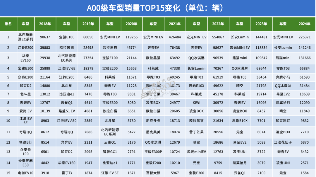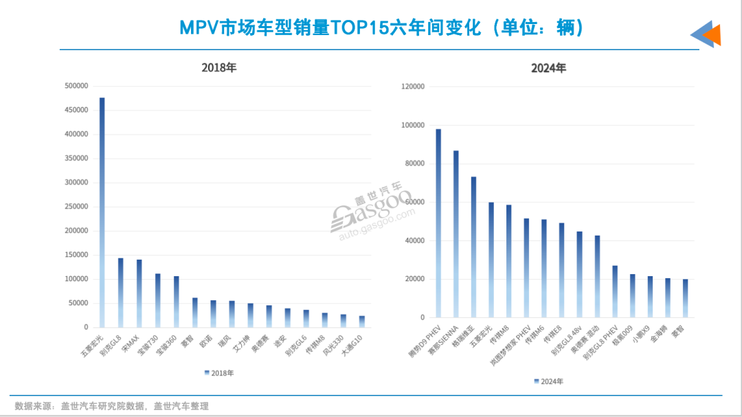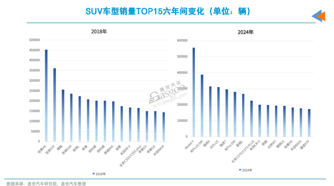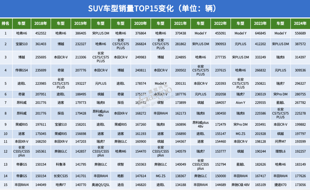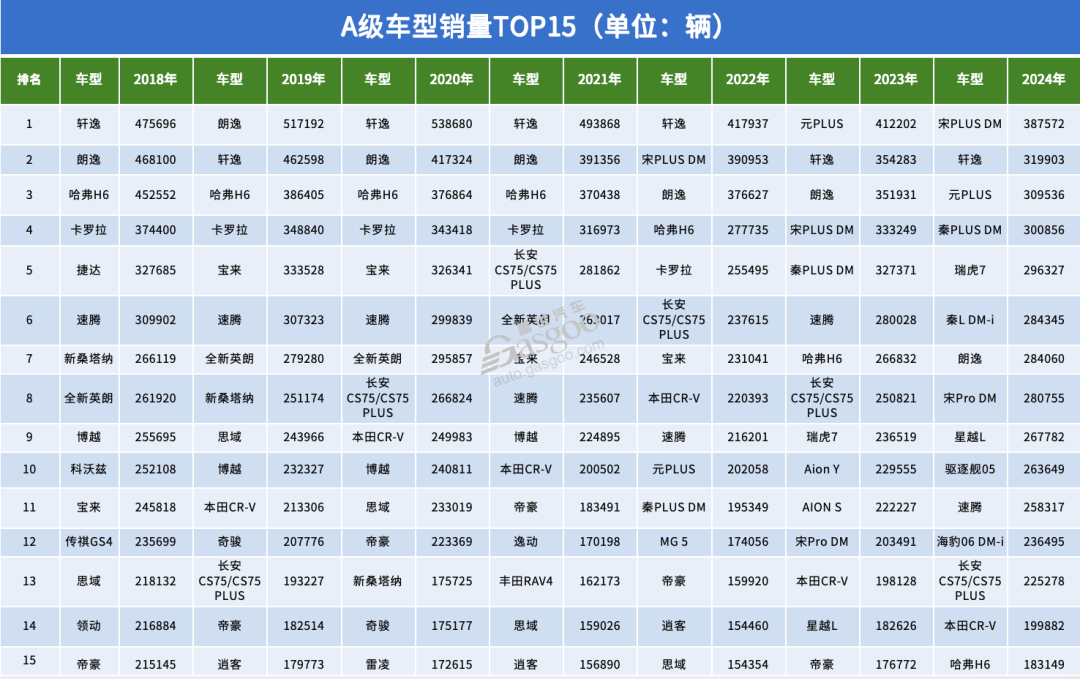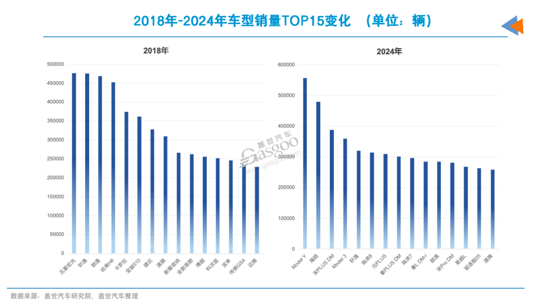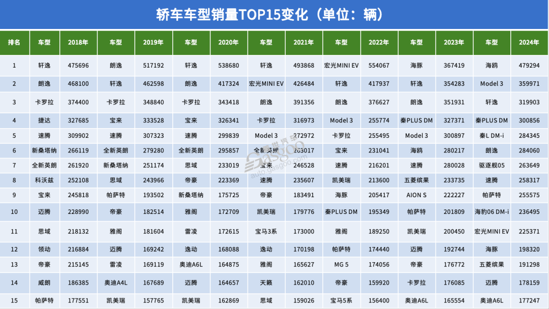 根据盖世汽车研究院统计的数据,盖世汽车整理了2018年-2024年六年间,从SUV、轿车到MPV三大不同类型,从A00级微型车到C级及以上车型不同级别,车型销量TOP15格局的变化。整体呈现的是:自主上,合资下;新能源崛起,燃油车萎缩。