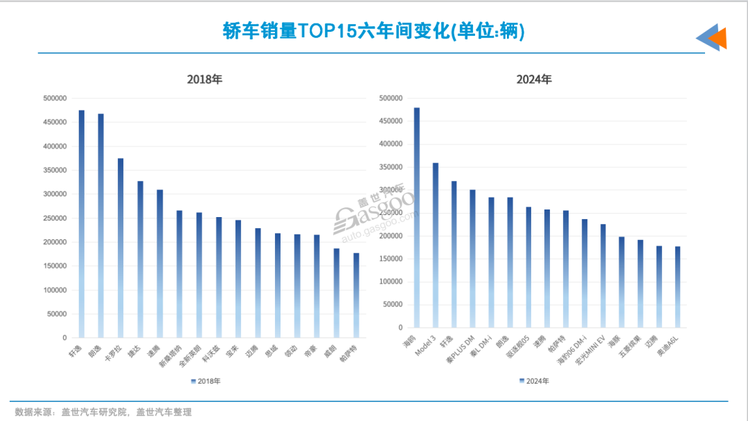 2018年-2024年六年间,各级别车型销量前15名排位的变化,是行业技术革新与市场竞争深刻演变的缩影。