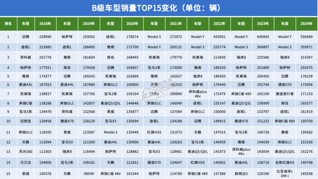 在特斯拉国产后,B级车市场也迎来格局变化。在2021年,B级市场车型销量前2名被特斯拉Model 3和Model Y霸榜,两款车型销量都超过20万辆,力压丰田的凯美瑞、宝马3系。受到特斯拉两款国产车型的冲击,叠加豪华品牌价格下探,大众系的途观L、探岳、迈腾,以及本田雅阁等B级车销量下滑,份额萎缩。