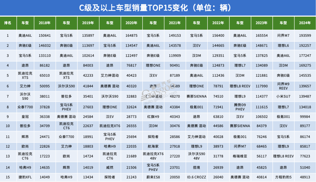 到2024年,自主凭借新能源、智能化攻入了更高端市场,C级及以上车型销量冠军变成了问界新M7。紧随其后的理想L6,年销量也超过19万辆。宝马5系、奔驰E级、奥迪A6L排名则下滑。其中,宝马5系到2024年销量直接腰斩至8万辆左右。