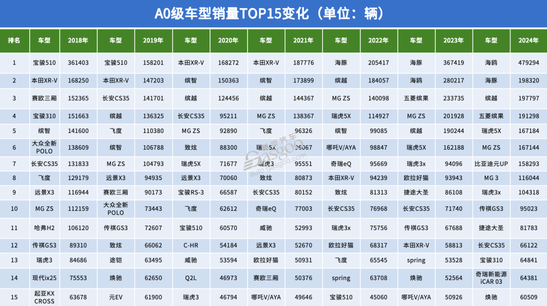 合资品牌在A0级市场地位下降。到2024年A0级车型销量TOP15,几乎全被自主品牌车型取代。本田XR-V、缤智等合资车型年销量已从15万辆萎缩至万辆左右。