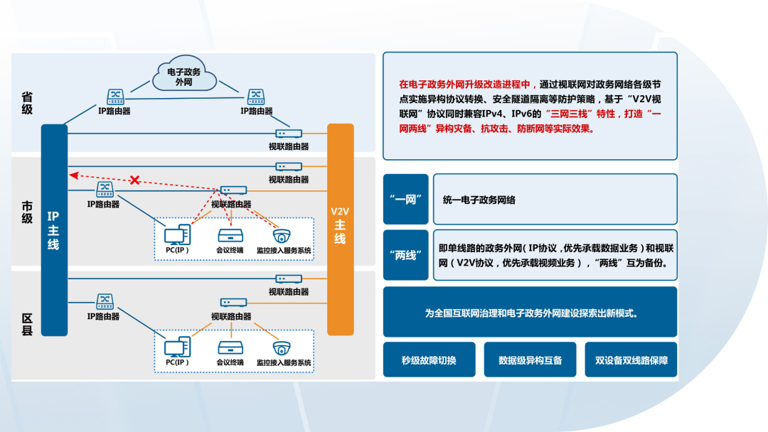 荆州市依托自主可控的视联网技术升级电子政务外网,形成贯通省、市、县三级电子政务外网的双链路、双协议、双系统网络传输应用体系。在协议层强化“主动防御”,建设异构灾备链路,全面落实了国家网络安全要求,保障政务网络、设备和数据的安全。