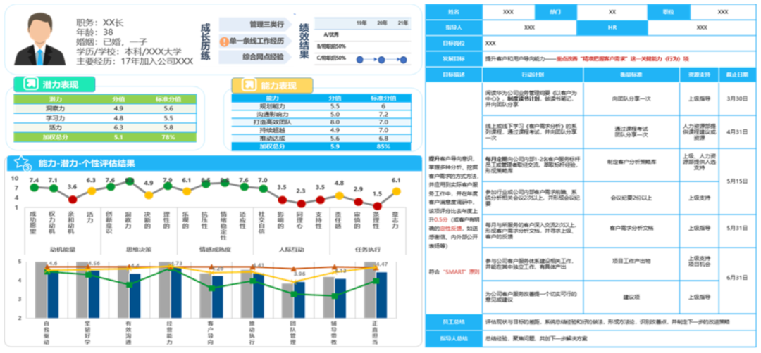 本阶段包含“培养实施”“发展评估”“动态应用”三个核心环节,以“人才培养项目”的规划开展为重心,结合公司发展目标和人才战略,靶向设计培养内容及形式,跟踪培养过程中关键人才不同阶段的变化情况,持续体系化进行能力发展评估并输出团队或个人的发展建议,为人才管理“育、选、用”提供科学量化的落地应用。