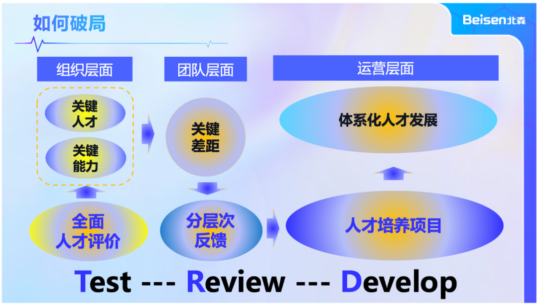 北森“T-R-D”模式主要针对破局解决人才培养“真问题”,提出人才培养发展的体系化解决技术框架。从“组织层面”到“团队层面”再到“运营层面”系统性解决问题。
