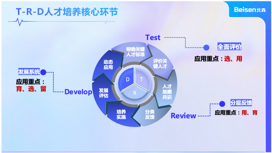 然而,要想让人才发展一体化真正落地,发展期和成熟期的企业要将人才标准(任职资格+潜力+能力)应用融入到人才管理系统中,由此北森提出了能真正支撑人才发展一体化建设的“T-R-D”人才培养与发展模式。