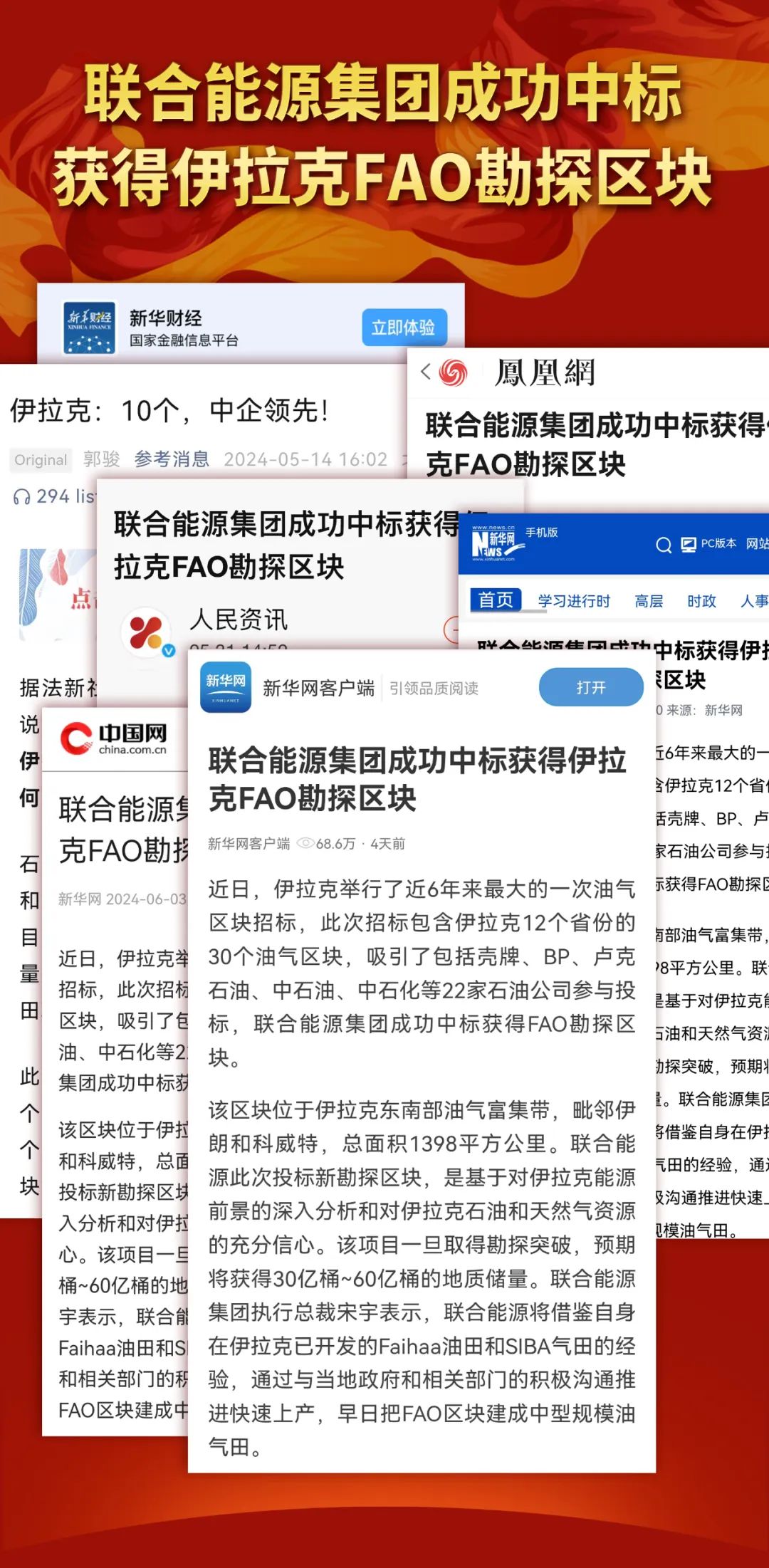 近日,伊拉克政府6年来最大的一次油气区块招标,中国企业的亮眼表现受到国内外媒体普遍关注,“参考消息”“新华财经”第一时间对此事进行了报道。随后人民网、新华网、中国网、中国日报网、中华网、凤凰网、新浪网等多家媒体争相报道。一直以来,联合能源致力于与中国“一带一路”倡议合作伙伴的务实合作,凭借自身在投资并购、技术创新、多元文化及精细化管理上的独特优势,持续在欧洲、中东、南亚、北非等地谱写能源发展新篇章,也是备受众多媒体关注的新闻焦点。