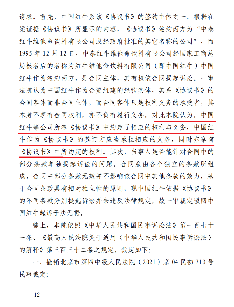 特别是,北京市高级人民法院(2023)京民终935号生效裁定书已认定中国红牛是50年《协议书》签约主体,享有该协议约定权利。