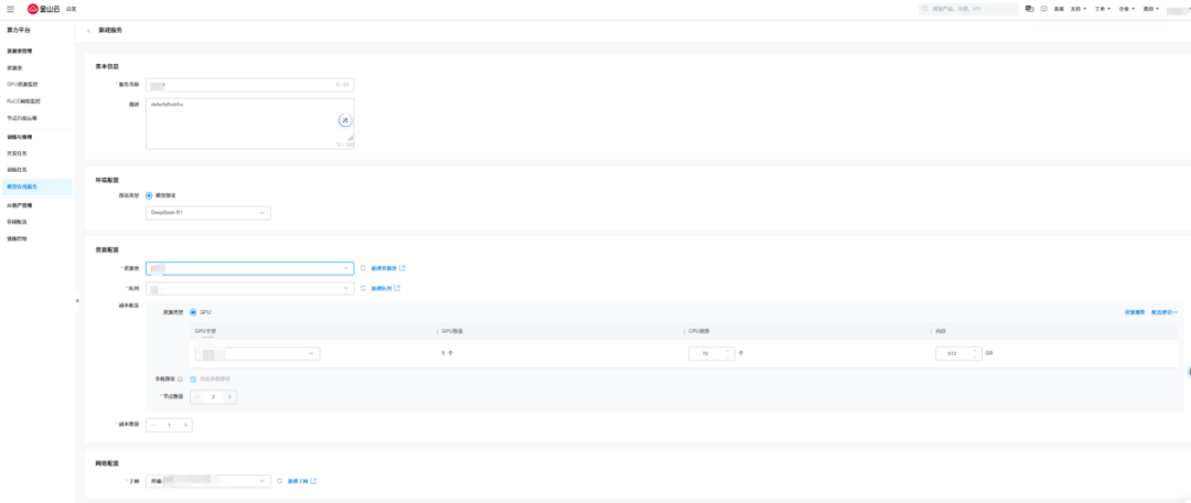 a.选择R1或V3模型,平台默认勾选多机部署,用户可自主配置服务副本数以及多机部署的节点数量