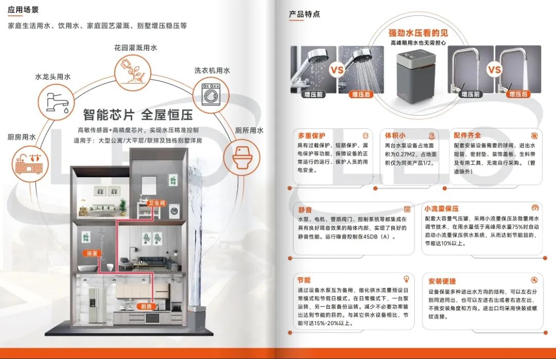 而利欧BWS-BJ智水星智能供水设备搭载的高敏传感器+高精度芯片更是实现了全屋水压精准控制。通过混合结构设计,搭配供水专用变频器,应用不同系列的水泵性能特性以及小流量保压及微量用水调节、循环软起、多点V/F曲线、超越模式等技术,满足周期用水需求大、用水场景复杂等使用情况。