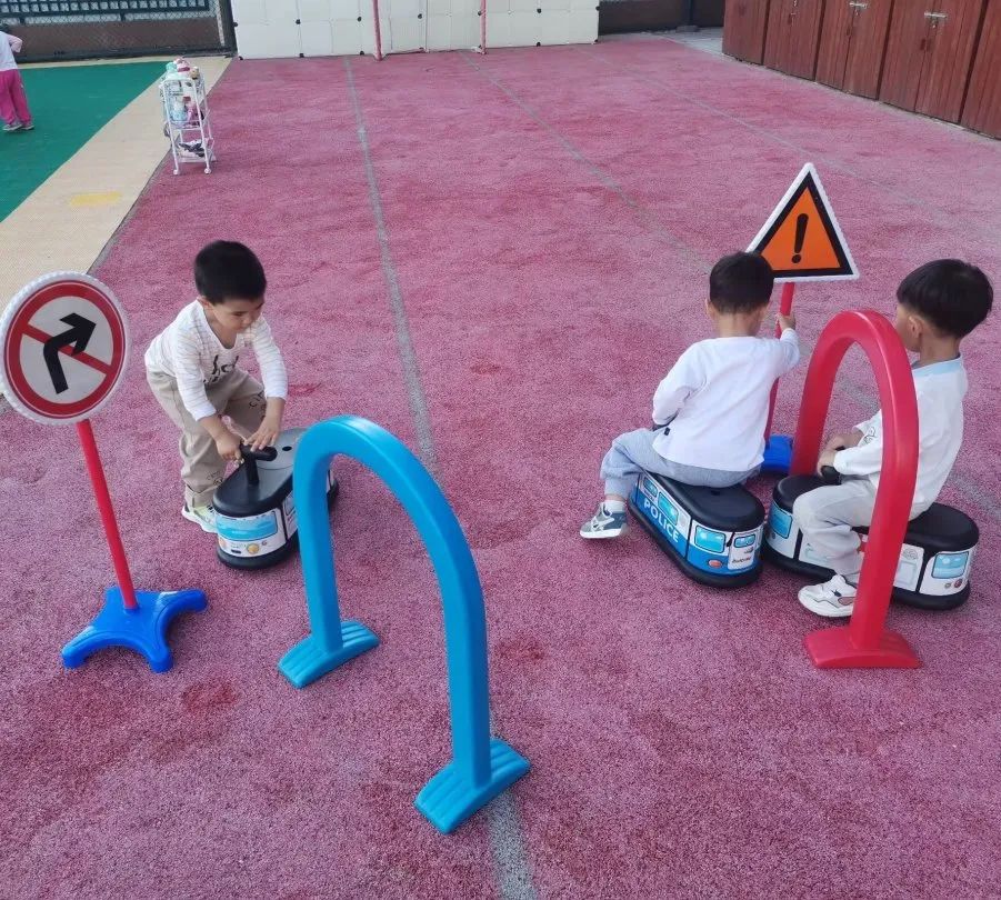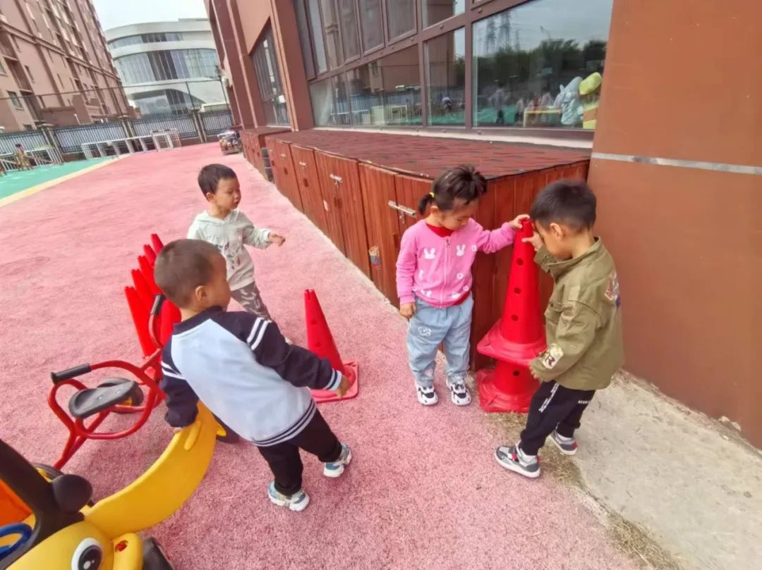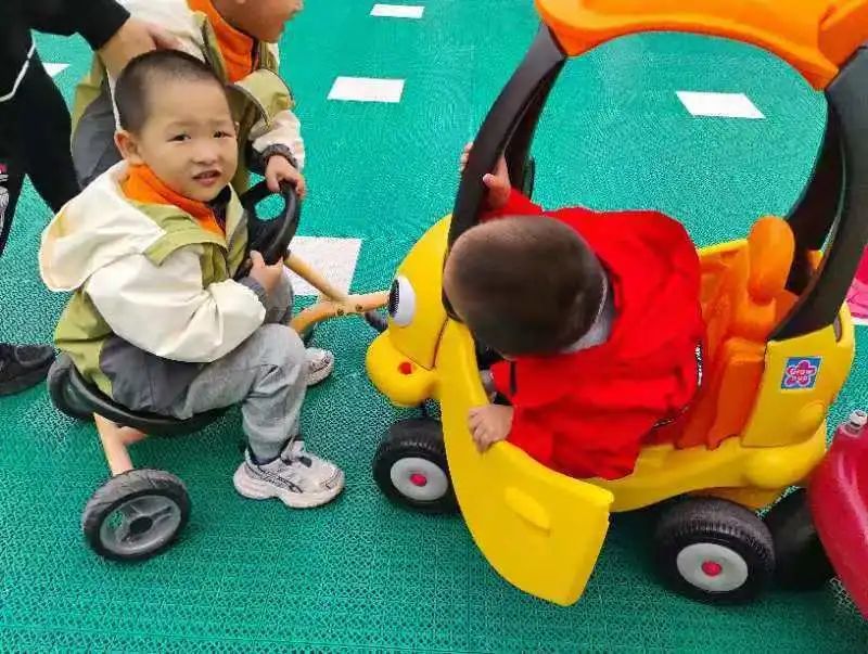 小朋友们熟练掌握骑小车的技能后,便迫不及待地开启了骑行,玩的不亦乐乎。然而,随着游戏的深入,问题也随之而来——有好几个小朋友不慎发生了“撞车”。面对突发状况,孩子们纷纷思考了解决办法。