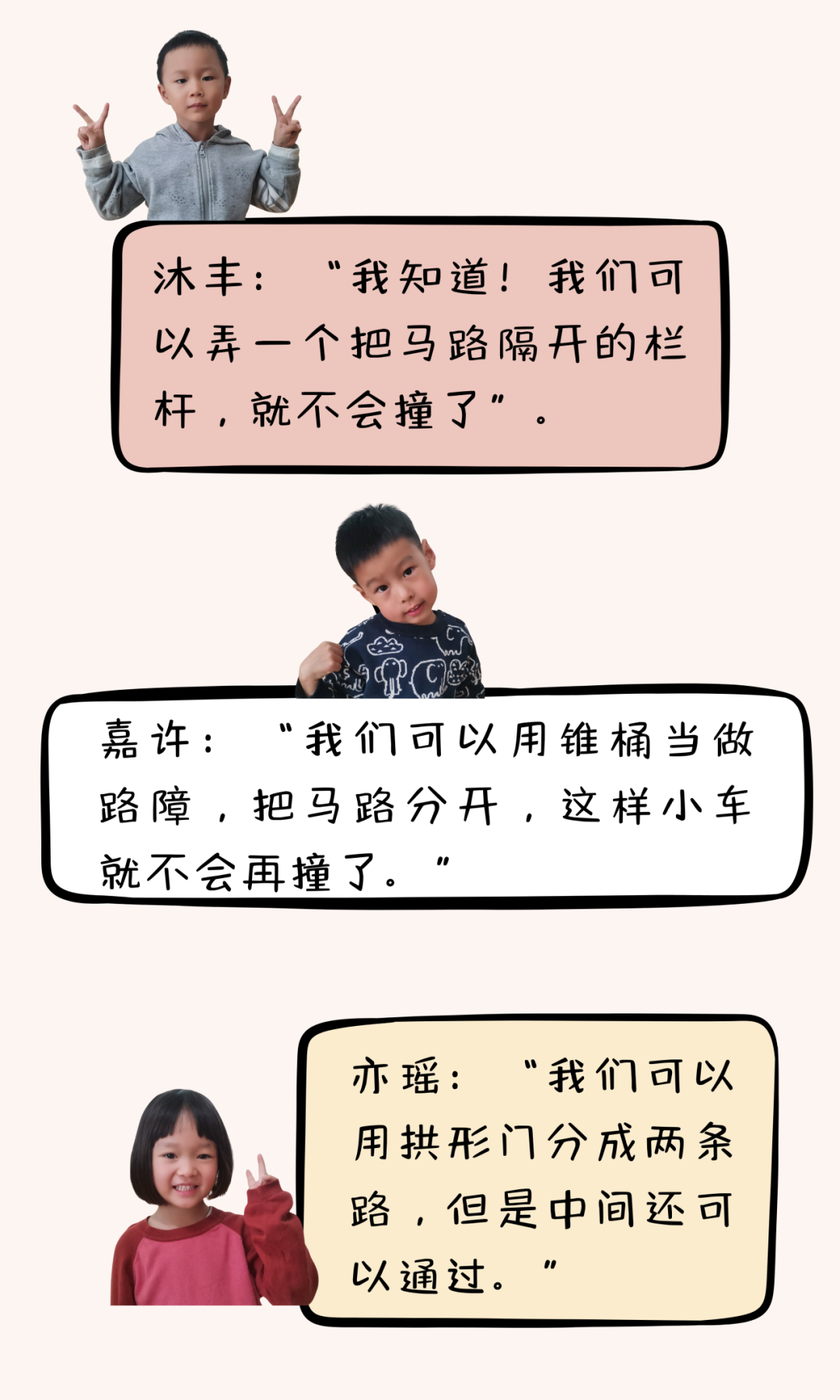 陈嘉许立刻响应,他跑过去指给其他小朋友看:“那让我们来摆摆看吧”,孩子们随即合作布置了简单的交通标志。