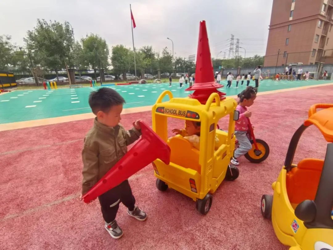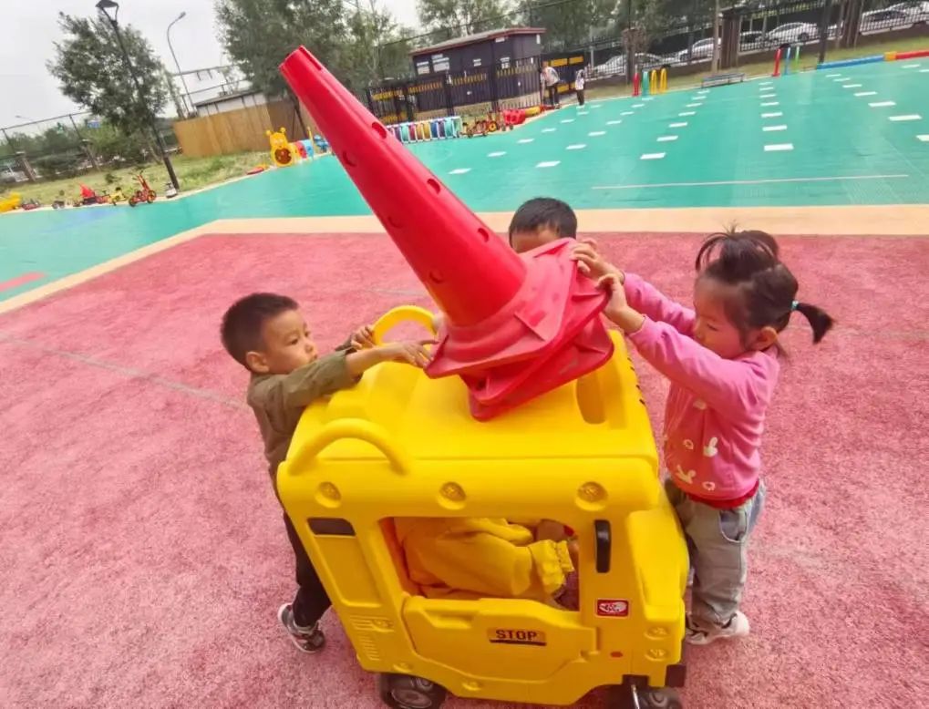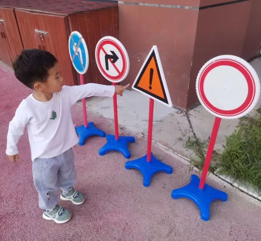 思洛指着操场上的交通标志喊道:“我在马路上有看到很多交通标志,是爸爸告诉我的,我们可以放一些来提醒小朋友。”