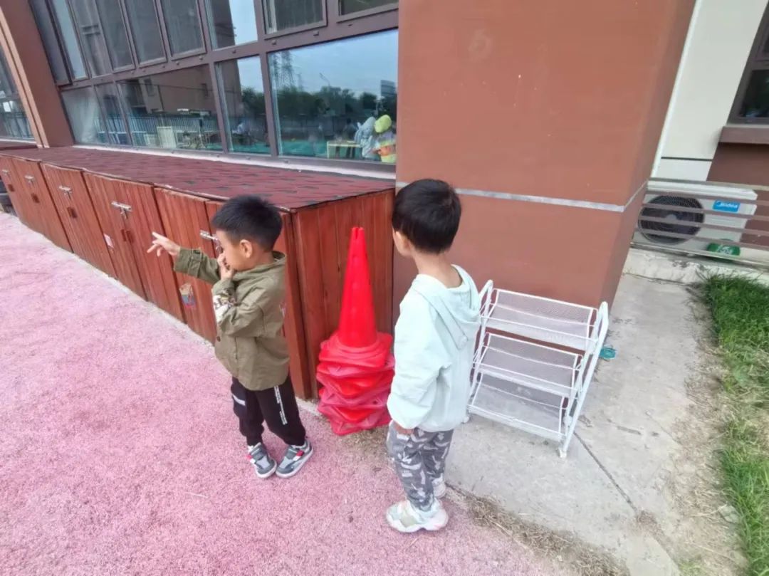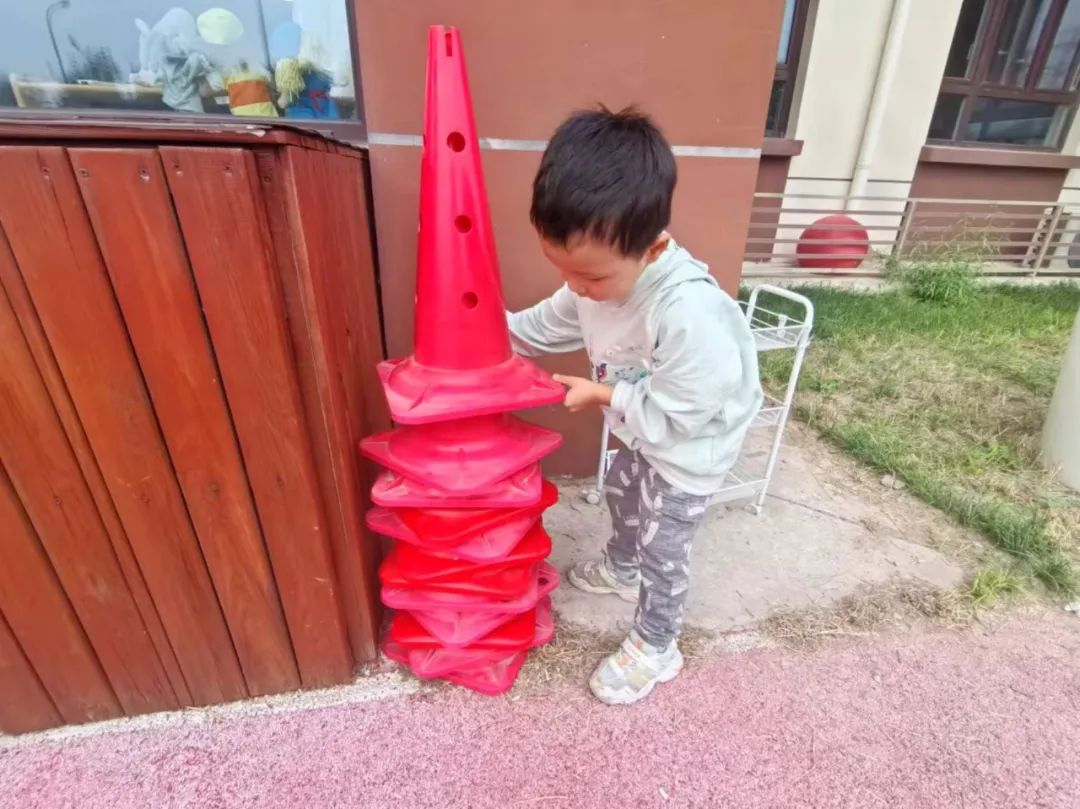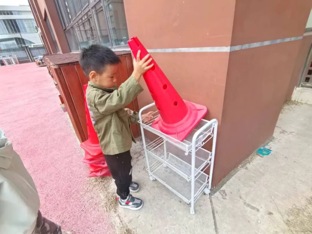 这时,孩子们看到操场上有一个可以放水杯的车子,“我们可以把这个锥桶放到架子上!”。经过尝试,小朋友们发现水杯架的宽度太窄,一次最多只能运输一个路障,速度明显很慢。经过几次试验,孩子们脸上渐渐露出一丝困惑,显得有些不知所措。我温和地引导他们:“别急,咱们再仔细观察一下,说不定能找到更好的办法。”