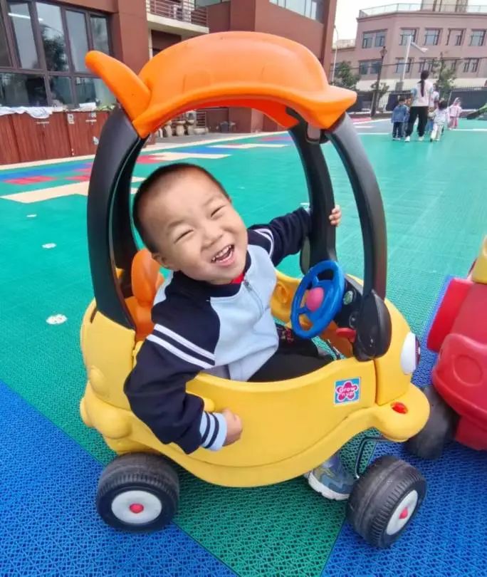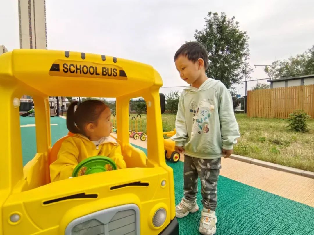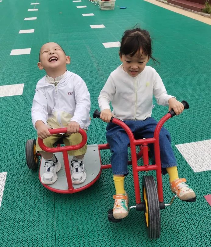 亦瑶骑在一个双人小车上,小脸红扑扑的,用力地蹬着,“我带着硕硕一起玩,我有点骑不动了”。