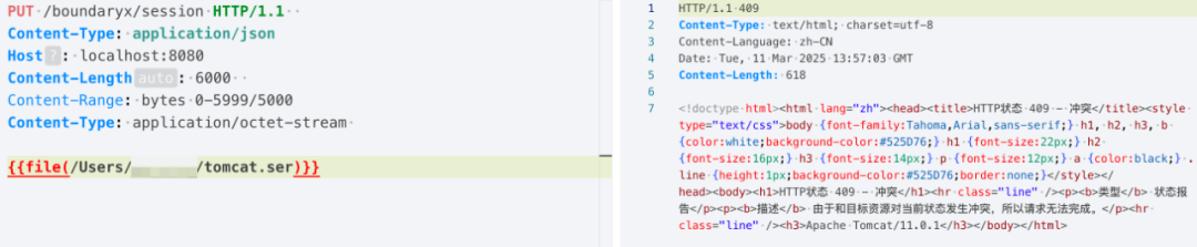 当启用了默认 servlet 的写入功能(将readonly 初始化参数设置为非默认值 false),以及支持partial PUT(默认支持)时,结合Tomcat的session文件存储功能,可以当classpath下面存在可利用的第三方库时可实现反序列化RCE。11.0.0-M1 ≤ Apache Tomcat ≤ 11.0.210.1.0-M1 ≤ Apache Tomcat ≤ 10.1.349.0.0.M1 ≤ Apache Tomcat ≤ 9.0.98通过PUT请求方式上传包含恶意序列化数据的文件时,文件路径中的分隔符“/”会被转换为“.”,导致恶意构造的file.Name可绕过目录限制,写入非预期位置。