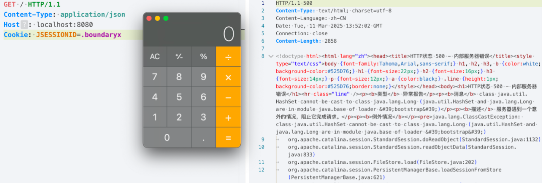 结合Tomcat默认文件会话存储机制,可以通过设置JSESSIONID=.fileName来触发依赖库的反序列化漏洞。