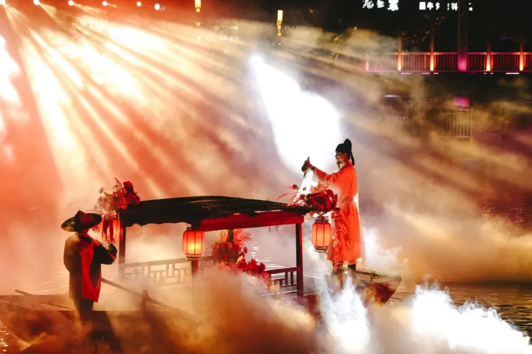 昆明融创滇池后海原创水上行进式剧目《滇池夜月》,以大明第一才子杨慎为主线,巧妙融合清代画家张士廉的“昆明八景“,生动展现明清时期边塞江南的独特盛景、民众生活。从云津夜市的市井烟火,到古渡渔灯的朦胧意境;从龙泉古梅的凄美爱情,到滇池夜月的诗意对吟,观众乘船入戏,可通过道具使用、演员互动等多种方式,了解并解读昆明的历史人文故事。