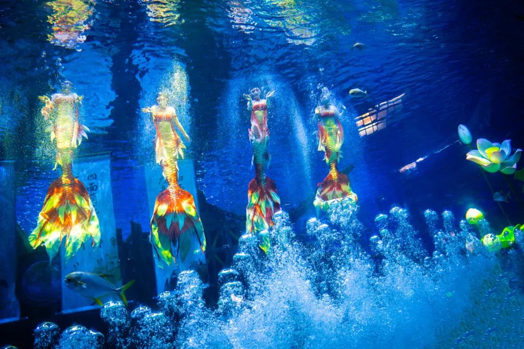 济南融创海世界展演的《荷间锦鲤》,以“泉城锦鲤”为创意灵感,巧妙融入“二安文化”及中国传统诗词元素,将诗词中蕴含的美感内涵与海洋世界的现代灵动相结合。在表演中,“锦鲤”穿梭于荷叶之间,在水中旋转、翻越、变换造型,划出一道道美丽的弧线,好像从李清照的诗词意境中悠然游出,让人宛若置身于“误入藕花深处”的绝美景色之中。