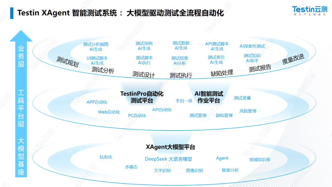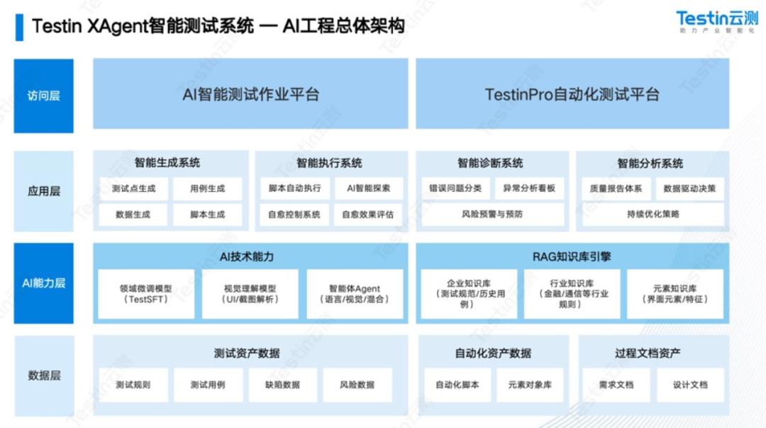 Testin XAgent采用多层架构设计,涵盖访问层、应用层、AI能力层和数据层,为企业提供全方位的测试体系支持。