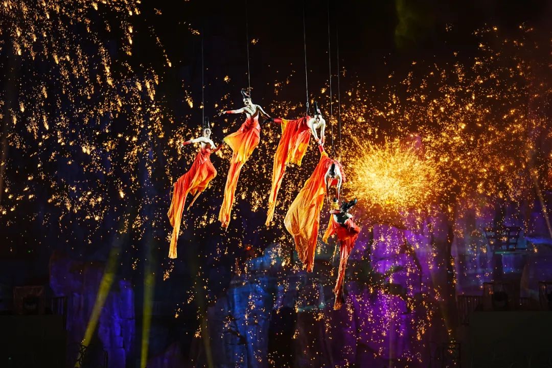 广州融创文旅城推出的大型国风实景秀《梦回岭南》,以岭南千年文脉为根,通过五幕篇章,串联历史人物诗词,展现岭南民俗与家国情怀。依托12层楼高的山体背景,首创多维动态表演空间,裸眼3D、巨型水幕投影等科技与非遗铁花秀、百人火焰跑山等技艺结合,打造奇幻场景。观众席与巡游通道互动,使观众能够沉浸式穿越于岭南山水之间,亲身感受岭南文化刚柔并济的独特魅力。